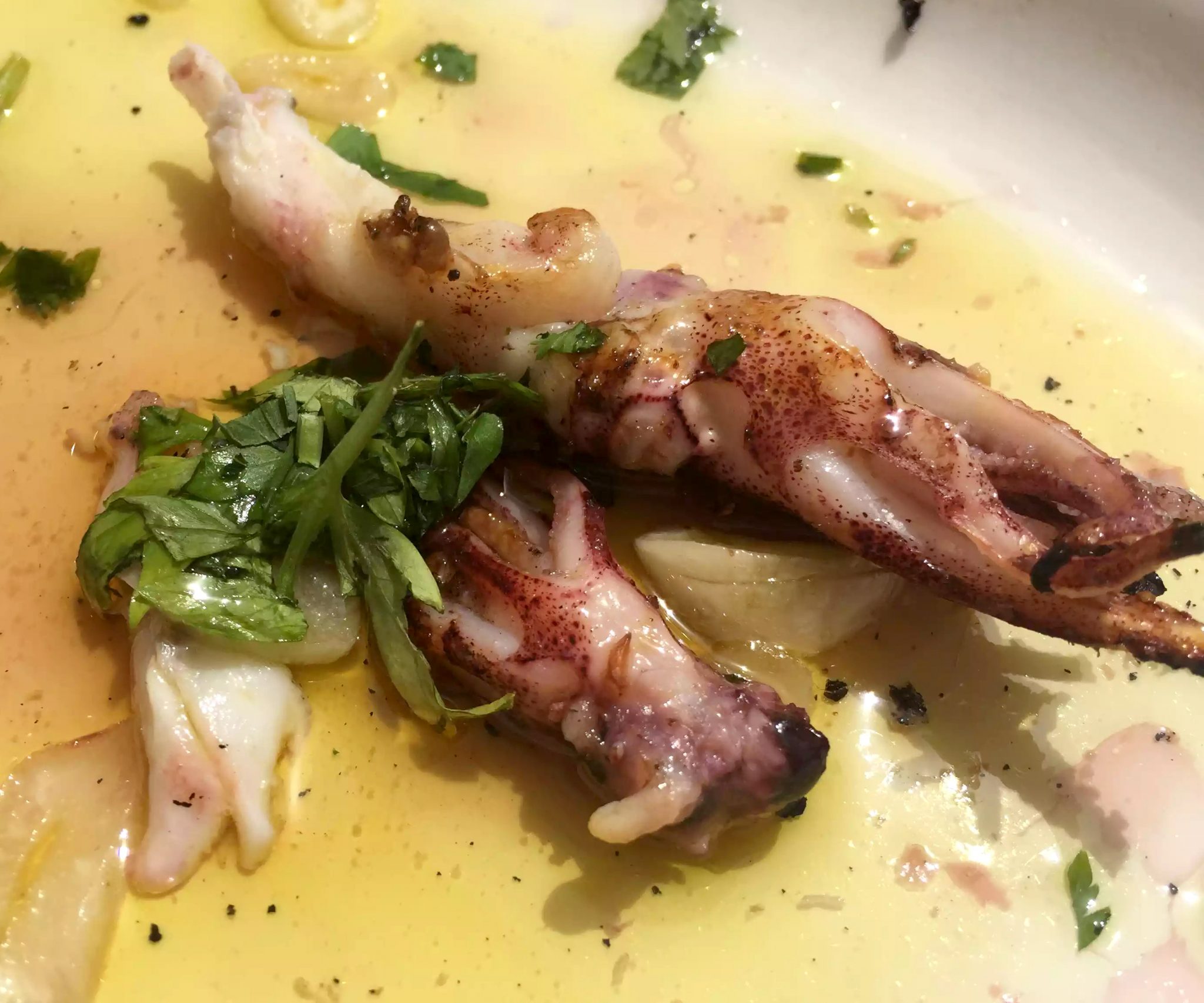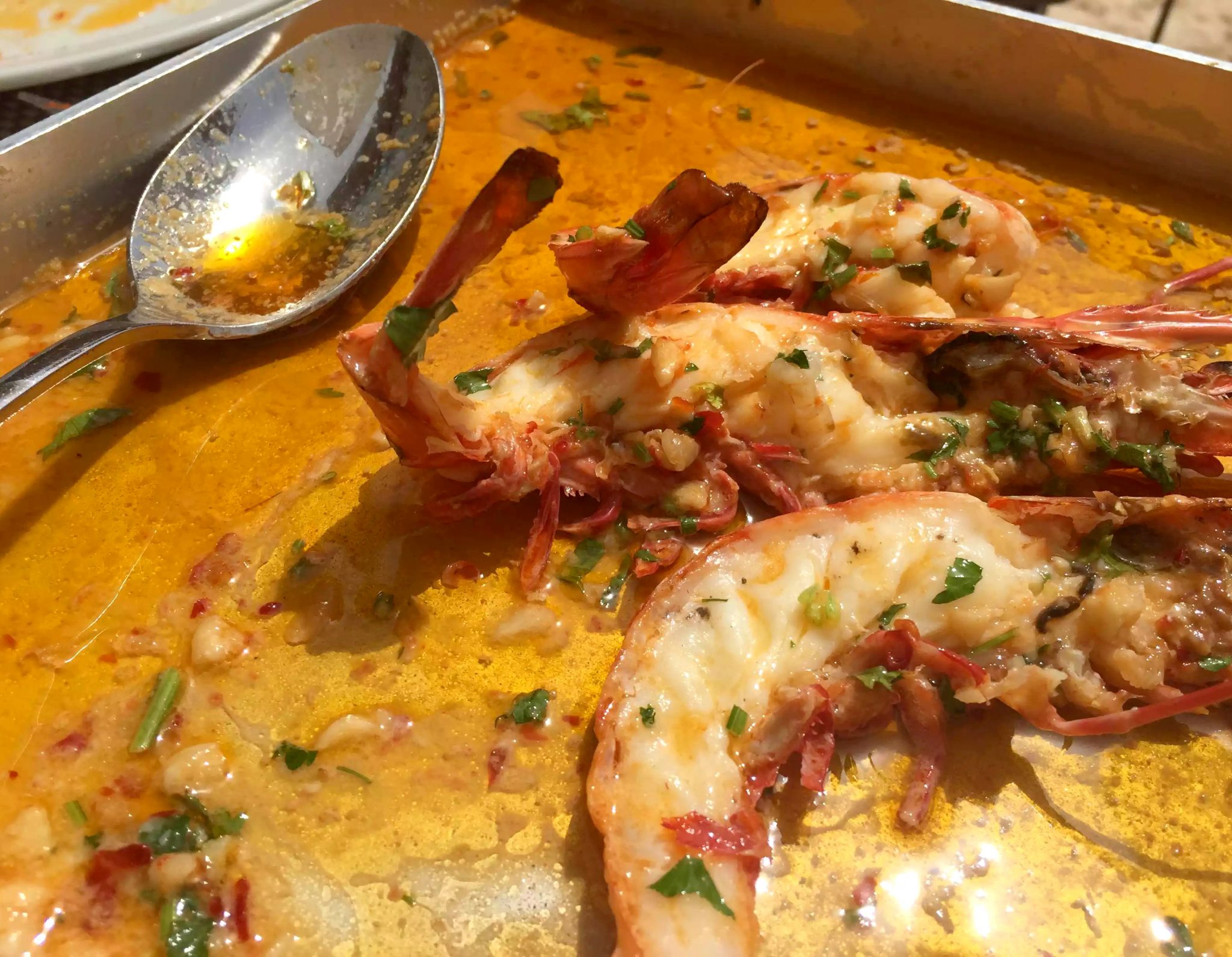 The menu at 2Passos has a tapas theme for the starter selections. There are plenty of sharing plates (mainly seafood dishes) but also some meat and charcuterie. We decided to order a few plates and share them, so we picked the ‘King-Fish’ (which is the Portuguese version of white bait), the grilled squid and the roasted red pepper salad. We’d decided that was enough until the table next to us had their food brought out. They had the most amazing-looking prawns (almost langoustine size) so we asked what they were – Tiger Shrimp Passos Style!) and ordered 4 of them as well!