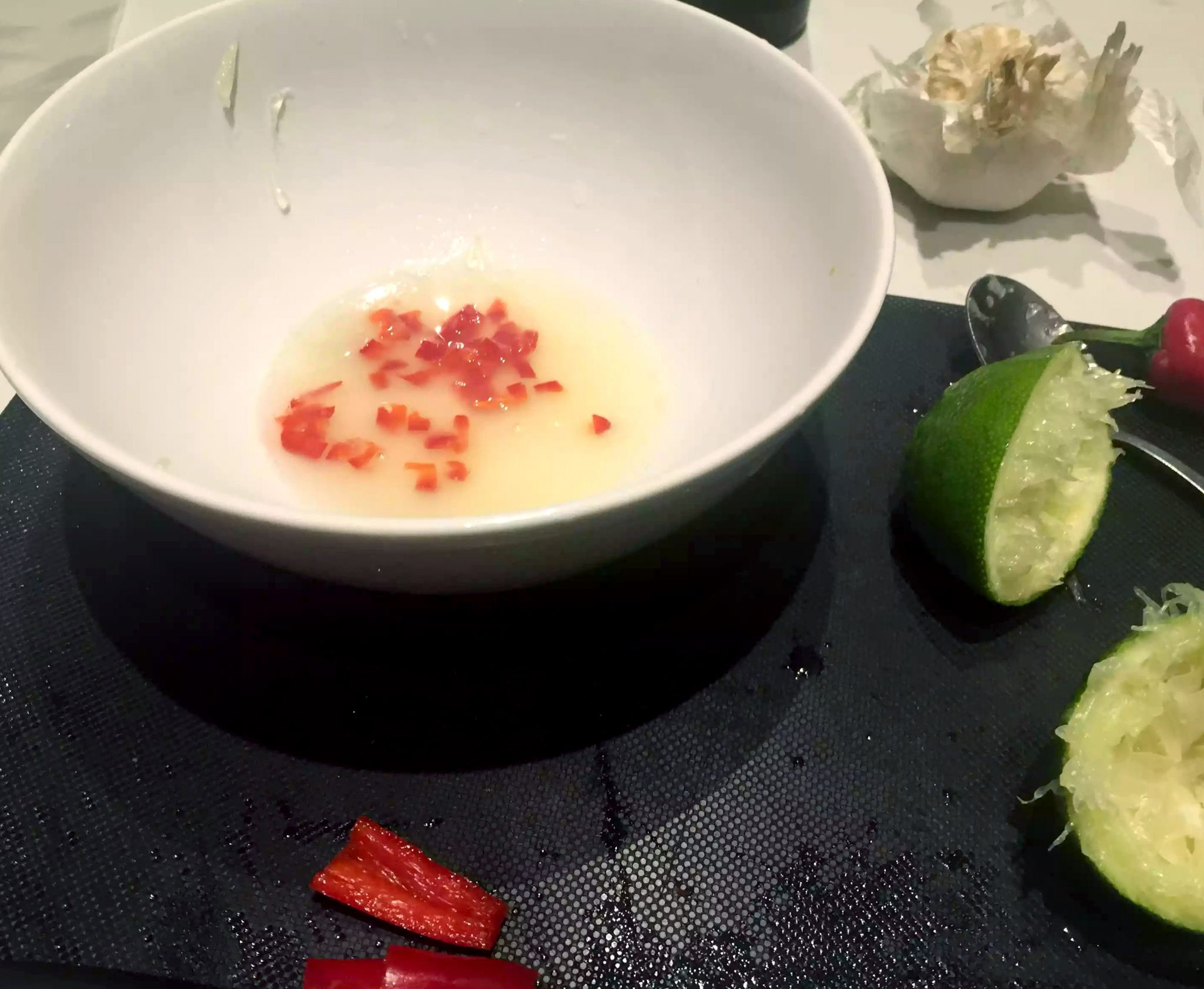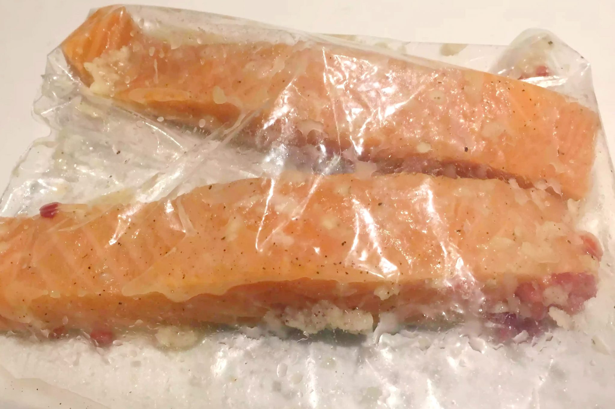 So to start with, I preheated the oven to 180C, sliced up the chilli, crushed the garlic, and squeezed the juice from the lime. I put this into a ziplock plastic bag along with the salmon fillets and massaged the marinade into the salmon making sure it was fully coated. Then I put this to one side while I prepared the vegetables.