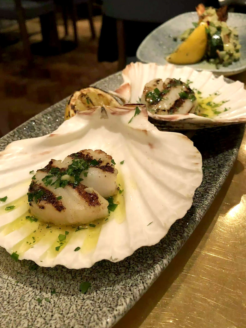 These first dishes didn’t last long so luckily the next few arrived pretty quickly. We’d decided on two seafood dishes and one meat. We’d ordered the char-grilled monkfish and prawn skewer (£10.15), the Queen scallops with garlic and olive oil (£10.95) and the fillet of beef medallions (£13.95).
