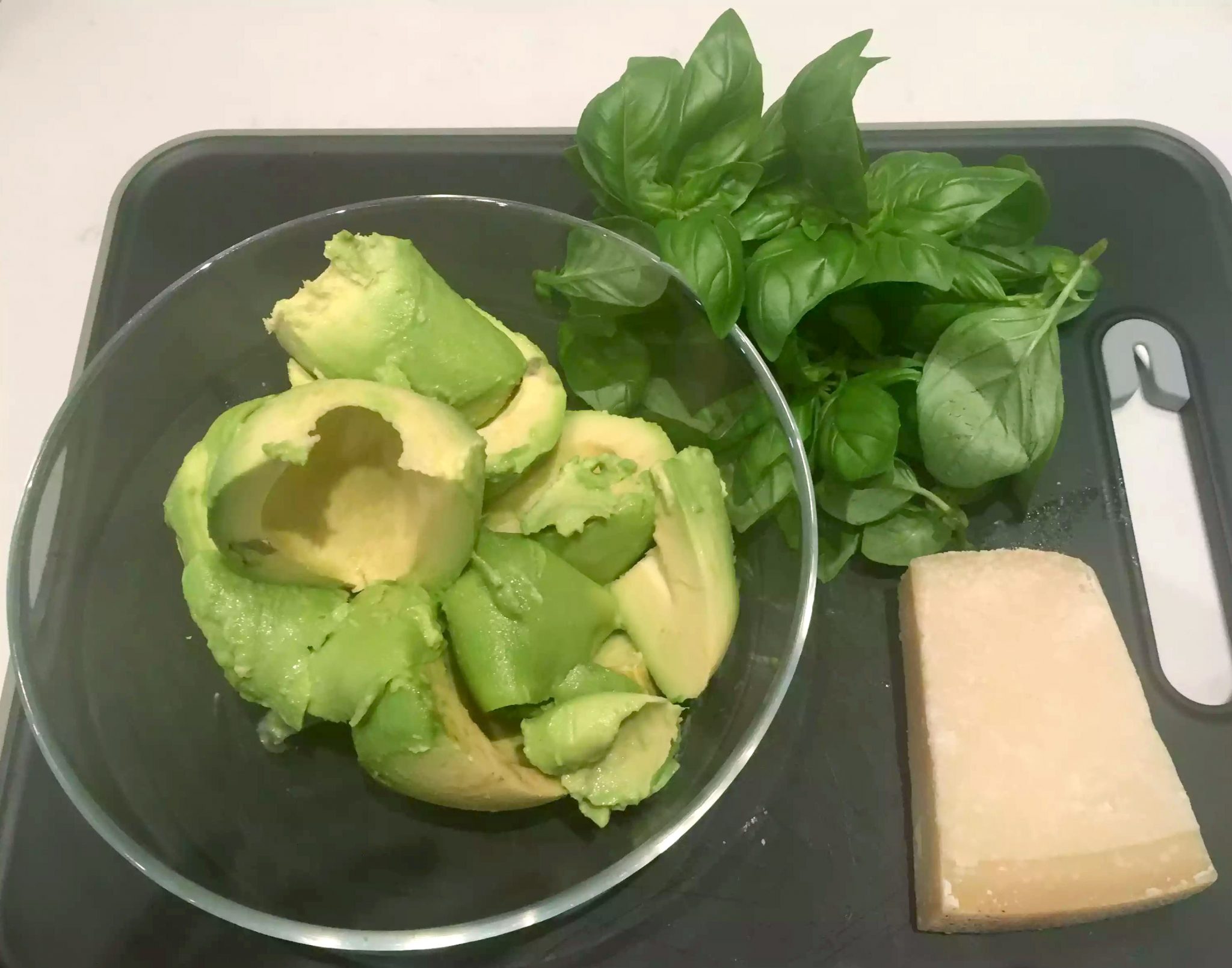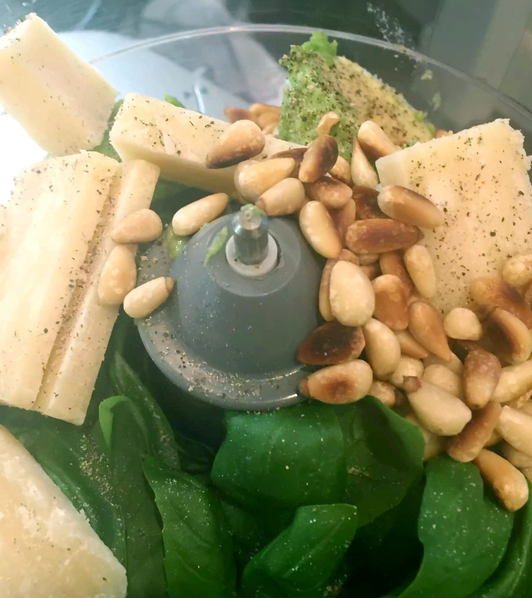 I added the toasted pine nuts (keeping a few back to top the dish with at the end), basil, avocado, garlic and parmesan (making sure to grate a small amount first to use as a topping later) to the food processor, along with a generous sprinkling of black pepper and a small amount of sea salt. Then I pulsed everything until it was smooth, scraping down the sides a couple of times to make sure that everything was incorporated.