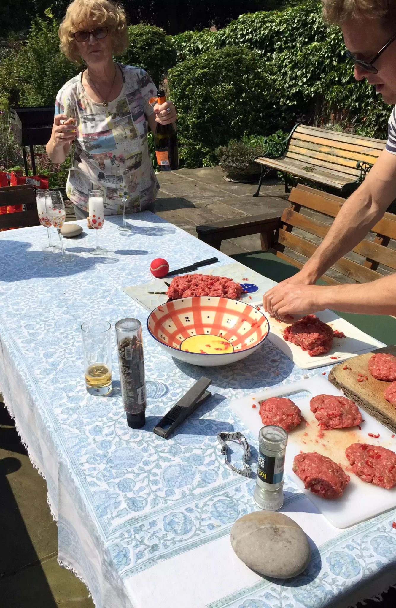 Today was no different and while Ali (his mum) set about making some sides and salads, Dan got started on the burgers. To the beef mince, he adds eggs to bind it, then chilli and garlic and salt and pepper. I’m not sure of the exact quantities as he makes it up every time. (Of course you could add any herbs/spices/vegetables that you want to the mix and use any type of mince – I’m thinking lamb mince with mint would work well, or maybe beef with spring onion and cumin). Then mold them into burger patties and they’re ready for the BBQ. You can see the recipe here.