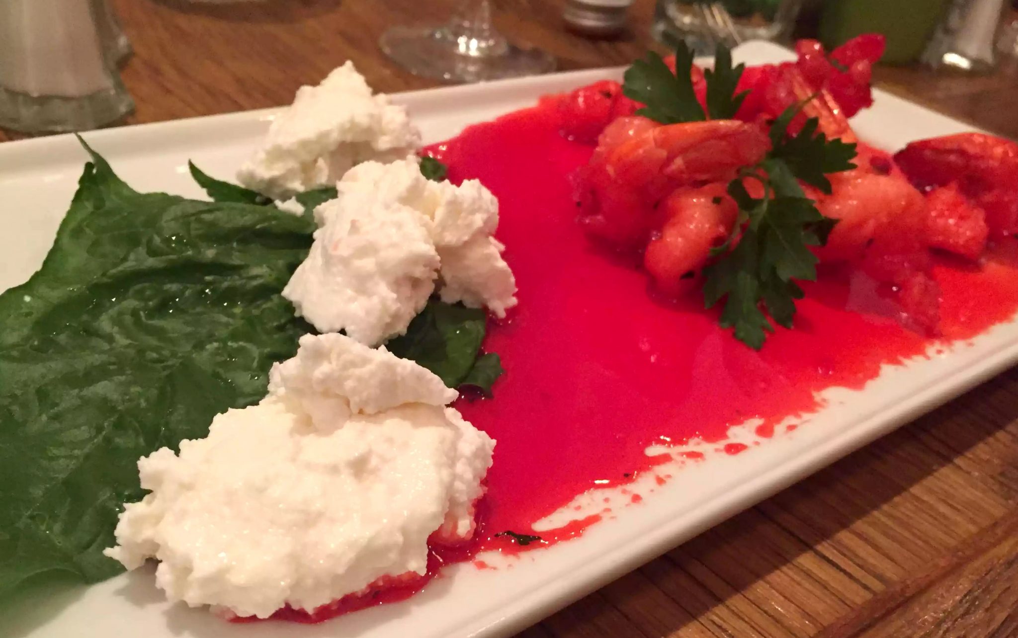 We ordered a bottle of Muscadet to drink with our starters which was light and citrussy and perfect to pair with seafood, even though I’d chosen the special of the day which was a Burrata served with avocado and tomatoes – I can never resist Burrata! This one was great, creamy and delicate and I loved every bite.