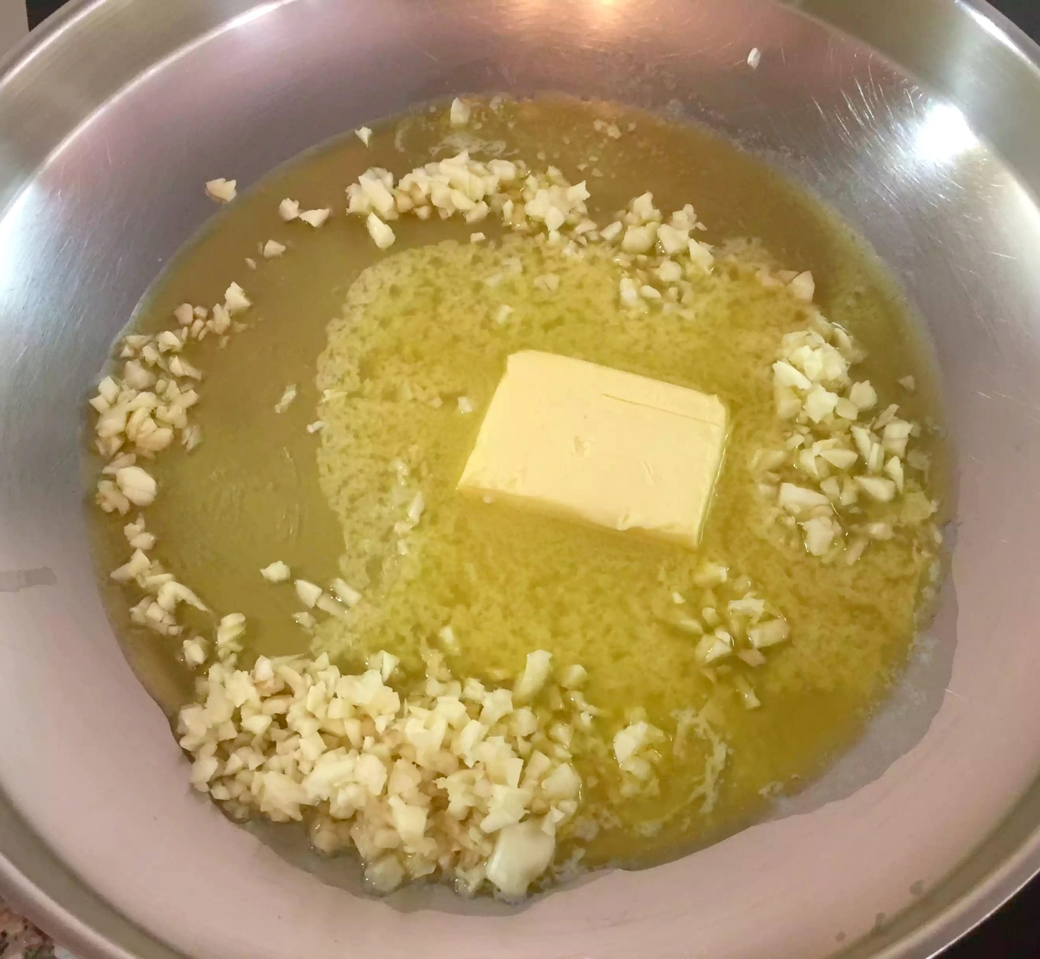 Meanwhile peel and chop or crush the garlic cloves. Add the garlic to the pan and cook on a low heat for 3-4 mins until it has softened but not browned. (If the butter is too hot then the garlic will burn and the sauce will be bitter). You could also add some chilli or any spices that you want, or some lemon juice (so many possibilities) but I decided to go with just plain garlic butter this time.