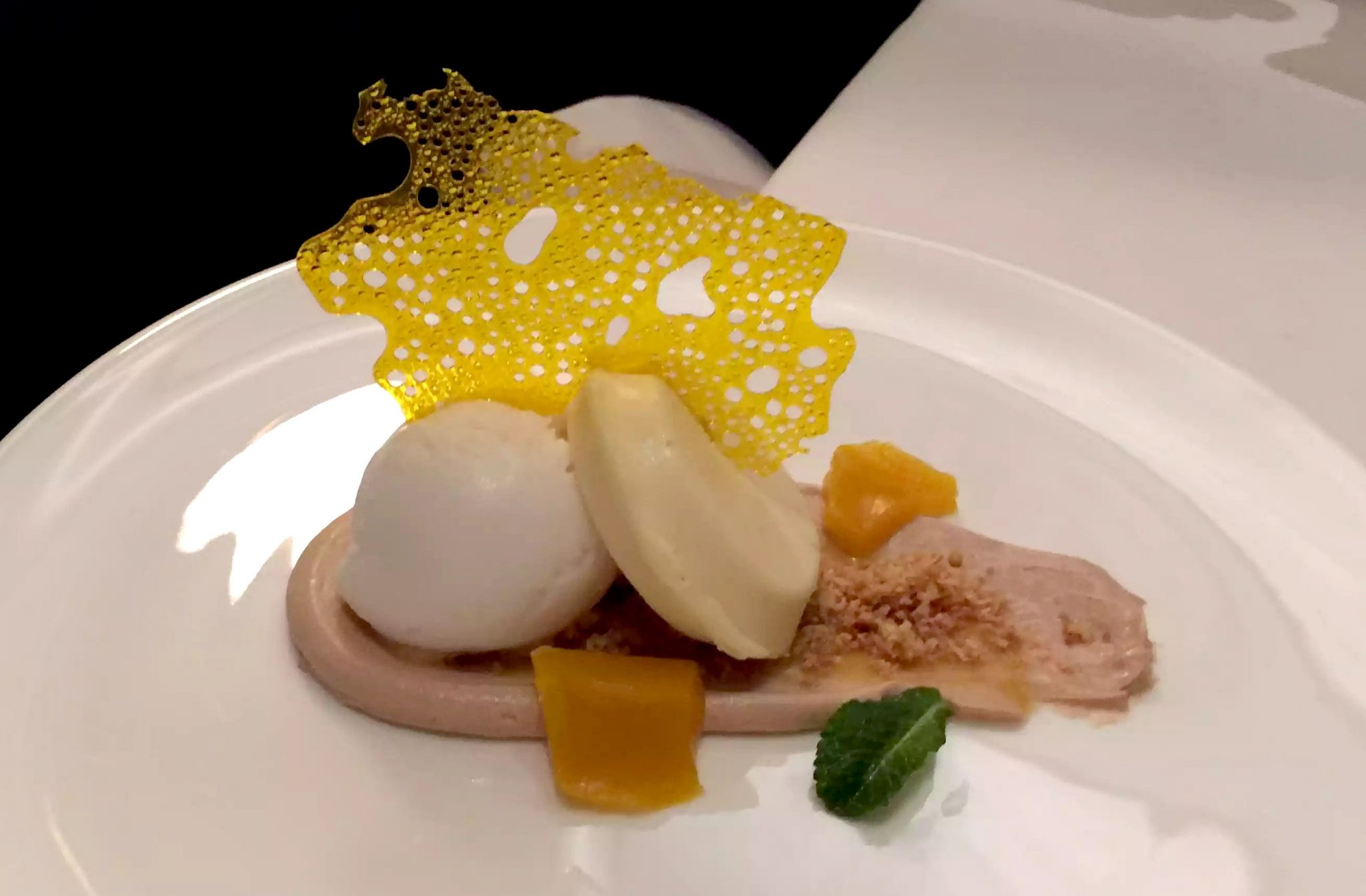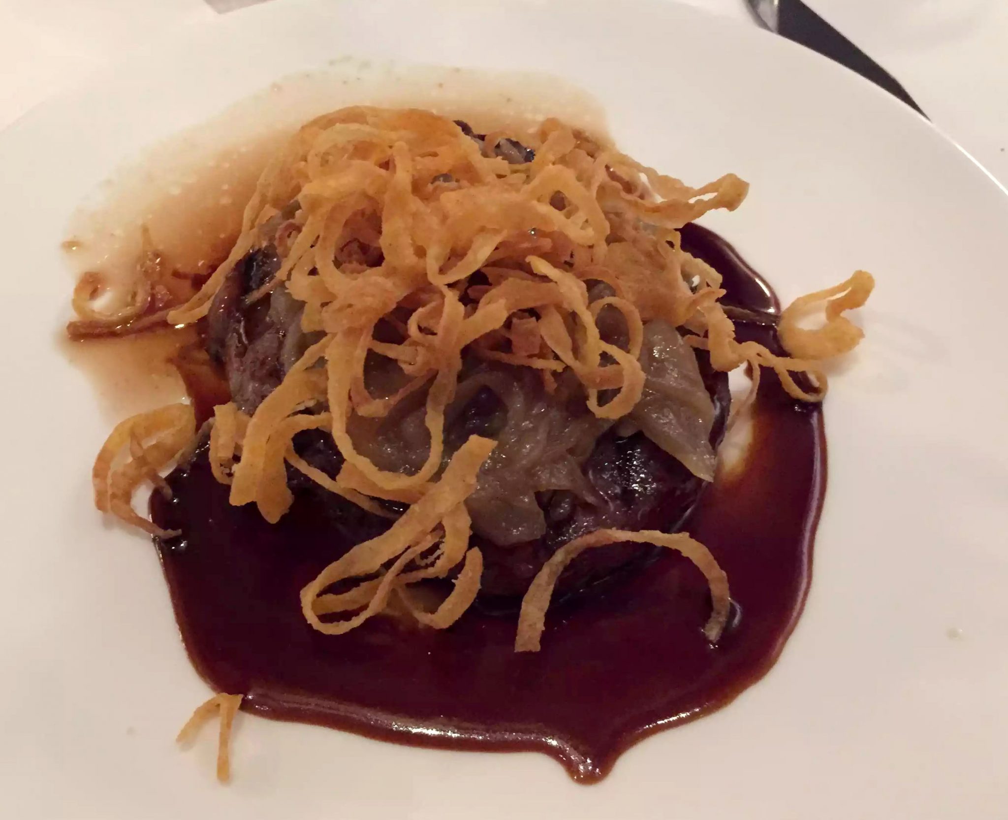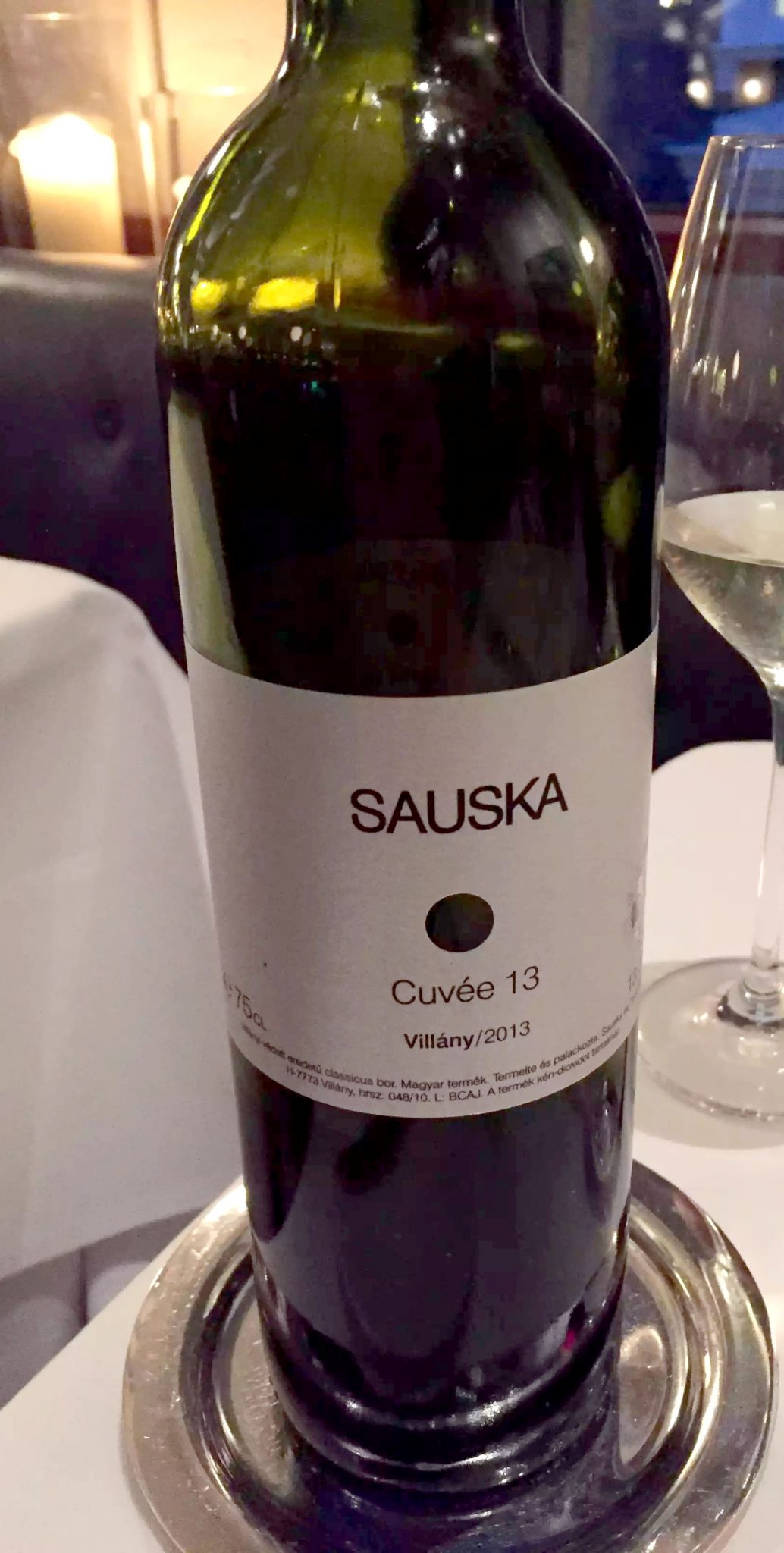 As usual, I forgot to photograph anything so all I have is the salmon tartare, almost completely demolished. The presentation was lovely though, and I kept my phone in my hand from that point so that I wouldn’t forget to photograph the mains. We ordered a bottle of red to go with the mains, a Cuvée (blend) from Villány, which the sommelier told us was a blend of Cabernet Sauvignon, Cabernet Franc and Blaufränkisch. It was delicious, well-rounded and maybe lighter than I would normally go for but lots of ripe red fruit flavours. It paired very well with my main which was the steak with crispy onions. It was a delicious aged rib-eye and was cooked perfectly (normally I love a rare steak but I tend to go medium rare unless it’s a fillet so that the fat has a bit of a chance to break down). The red wine jus that it came with was also delicious and I passed on the Spätzle that it came with which was a kind of buttery gnocchi type pasta, but the boys loved it. Dan had the lamb rack which he said was absolutely delicious and came with a wild garlic leaf and barley risotto.