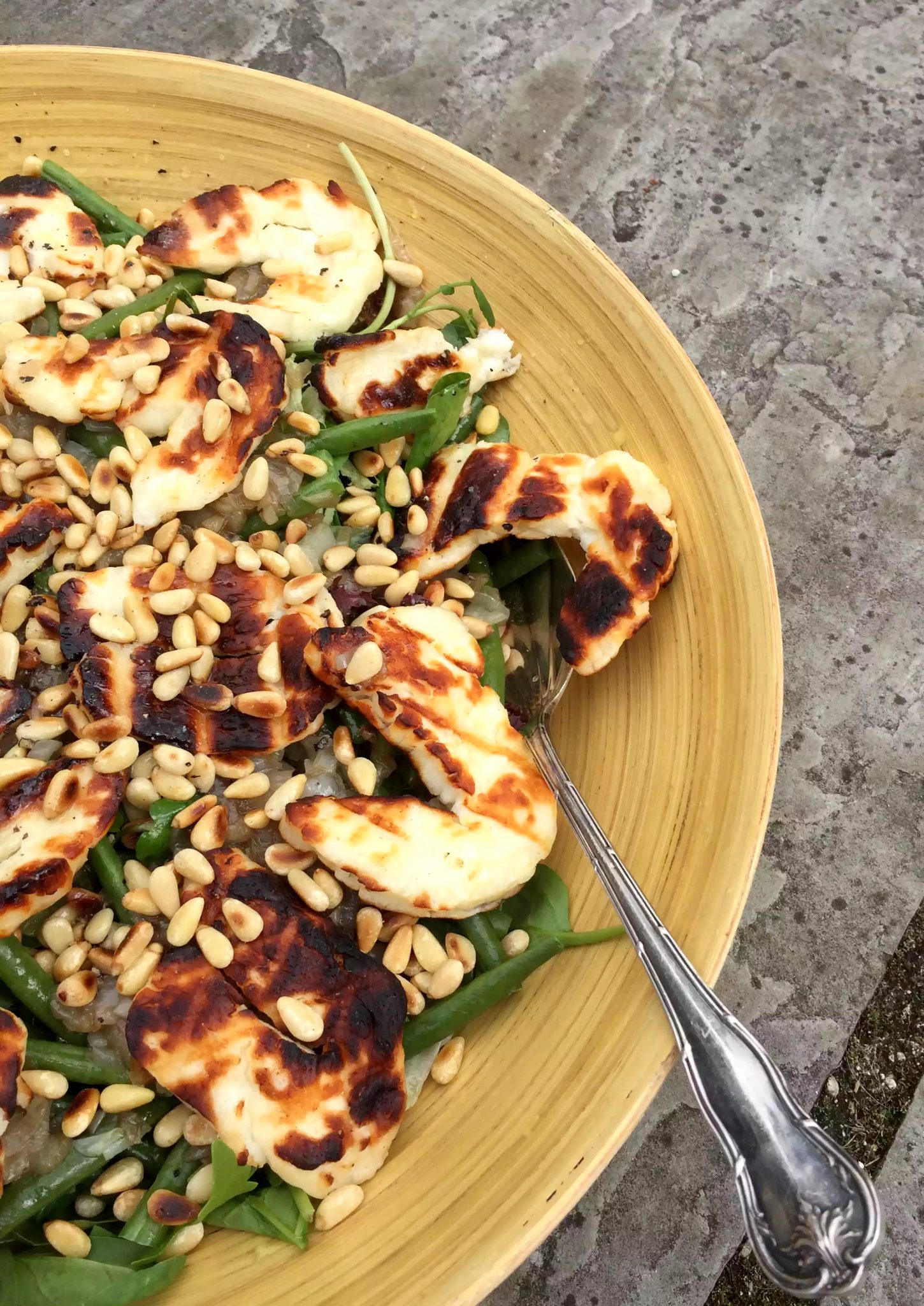 Grilled Halloumi, Caramelised Shallots, Green Bean & Pine Nut Salad with a Lime Dressing
