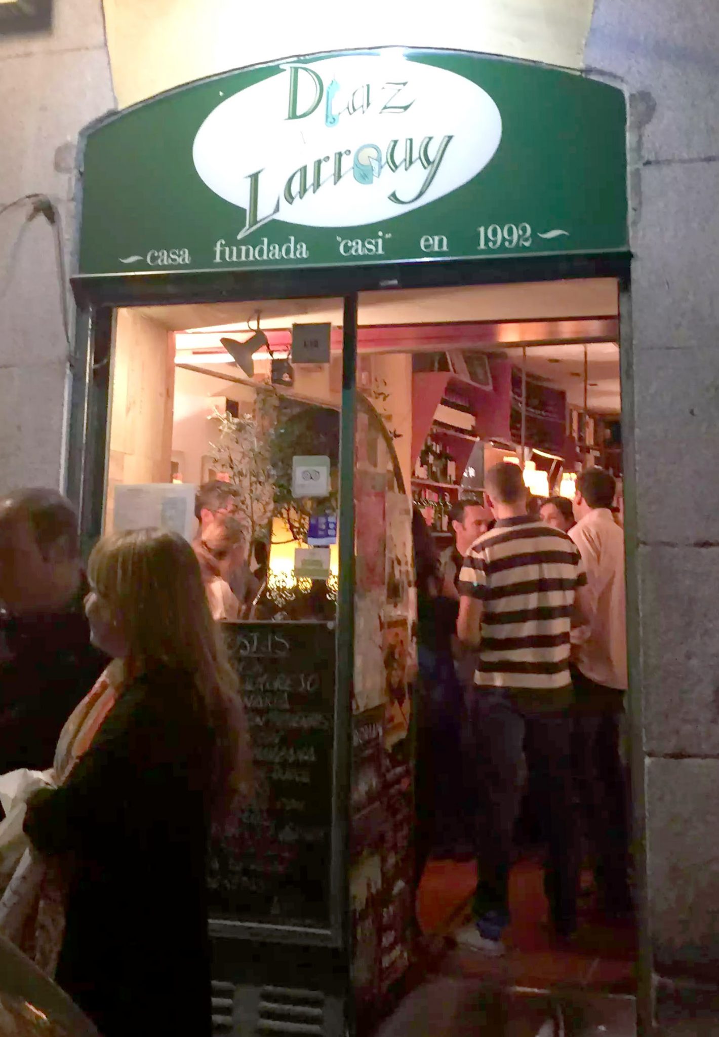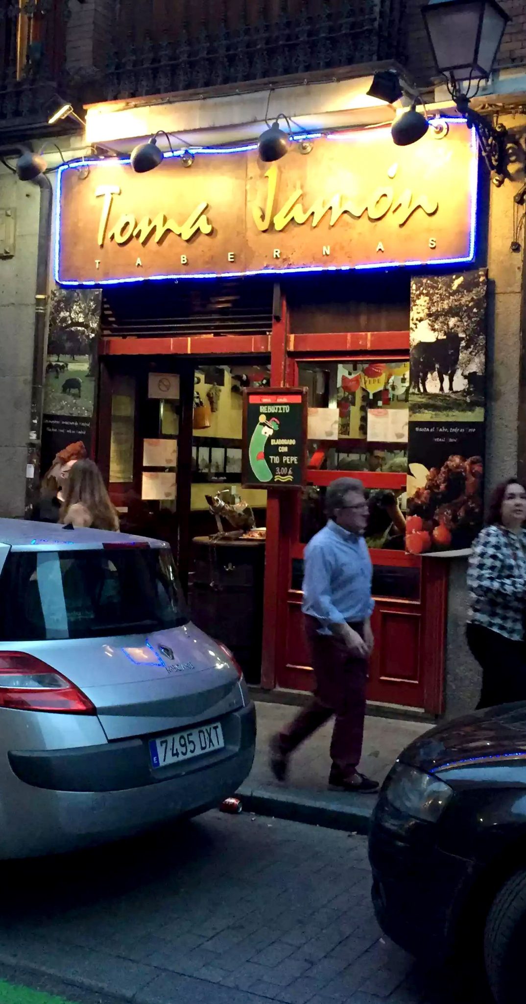 After sprucing ourselves up for dinner at the hotel, we decided to do Aperitifs the Spanish Way (with tapas) so we headed to a street called Calle Cava Baja, which is lined on both sides with Tapas Bars as far as the eye can see. We stopped at one of the first ones and ordered a Rioja for me and a Verdejo for Mum. They came with a tiny plate with a couple of pieces of chorizo and manchego as a free addition. I love how the Spanish always give you a tiny tapas portion of something to go along with your drinks, usually, ham, cheese, crisps, olives or small plates of tapas or paella. In fact, it’s considered pretty bad form not to offer anything. One more Tapas Bar and it was time to head to the restaurant.