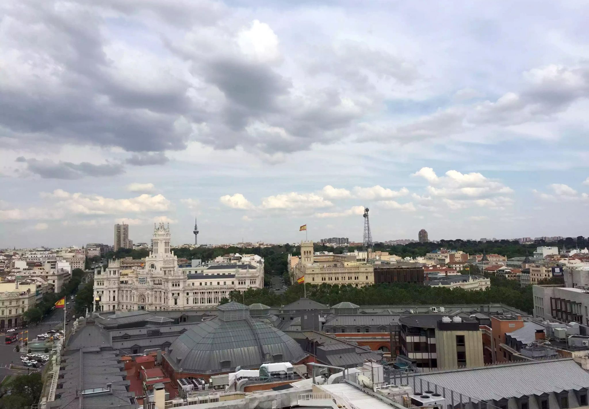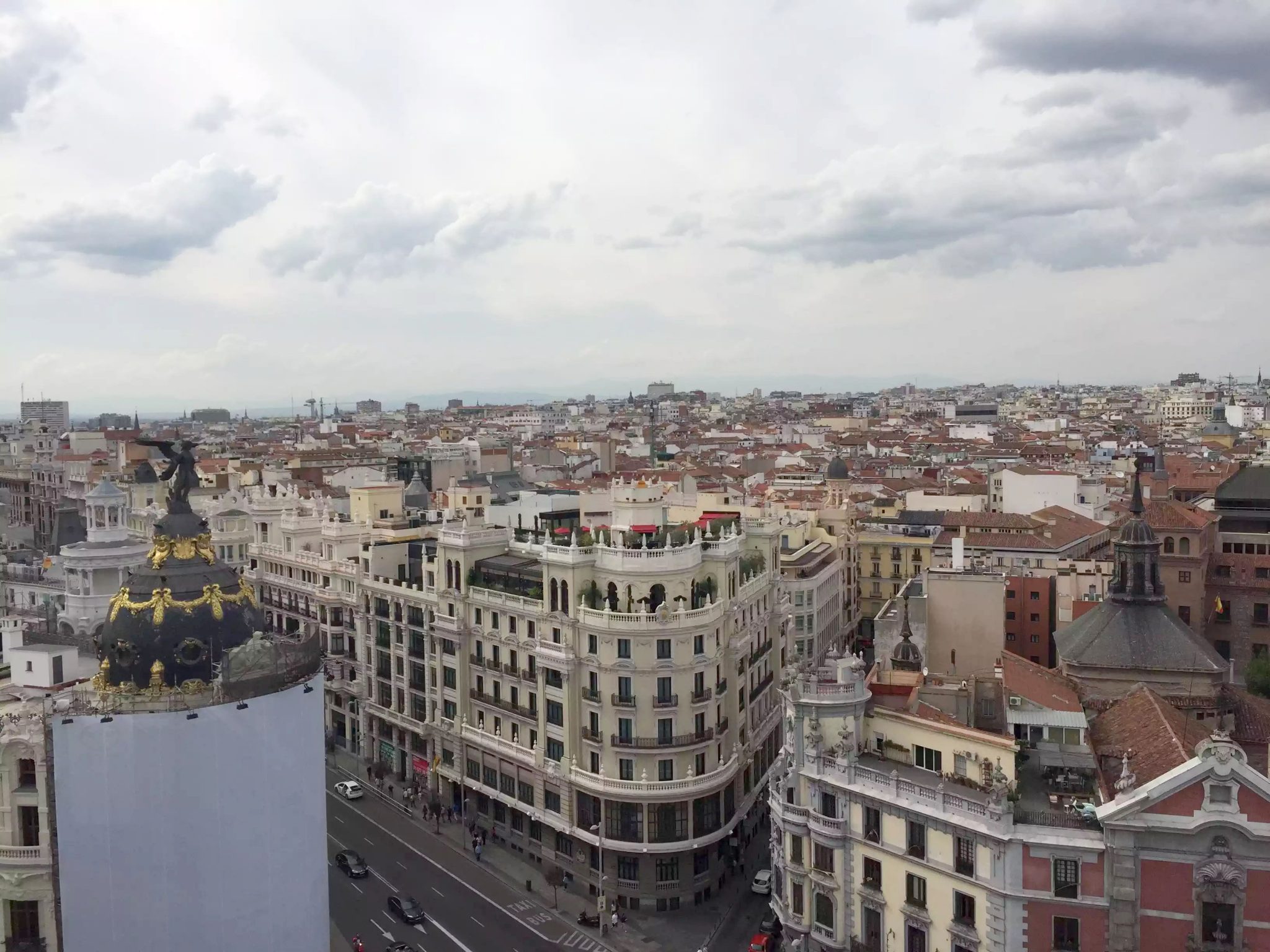 Leaving the park we headed for the Circulo de Bellas Artes as I’d heard they had a rooftop bar with a 360° view over the whole of Madrid. We passed the stunning Banco d’España on the way and had to take a photo. We queued to go up to the rooftop and the view was stunning. You could see for miles and you could walk round the whole building so you could see in every direction. Dan wanted me to buy my mum a birthday drink from him so I bought us both a Hendrick’s and Soda -16 euros! – a huge rip-off, but she’s worth it! We enjoyed the drinks and the view for a little while before heading back to the hotel to prepare for dinner.