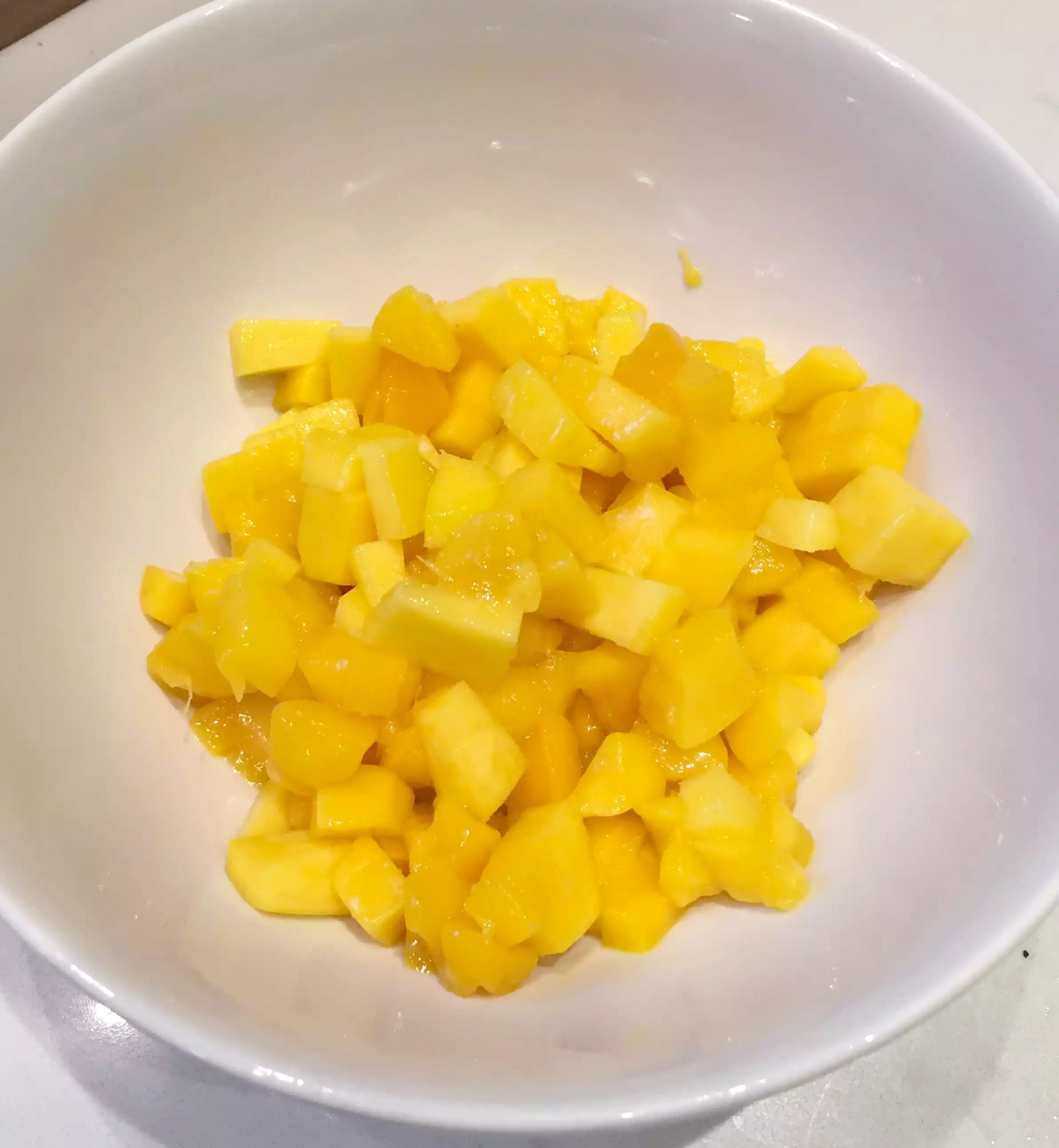 Dice the mango quite finely into about 1/2cm chunks and place in a bowl. Then peel and dice half a red onion to the same size and add it to the bowl.