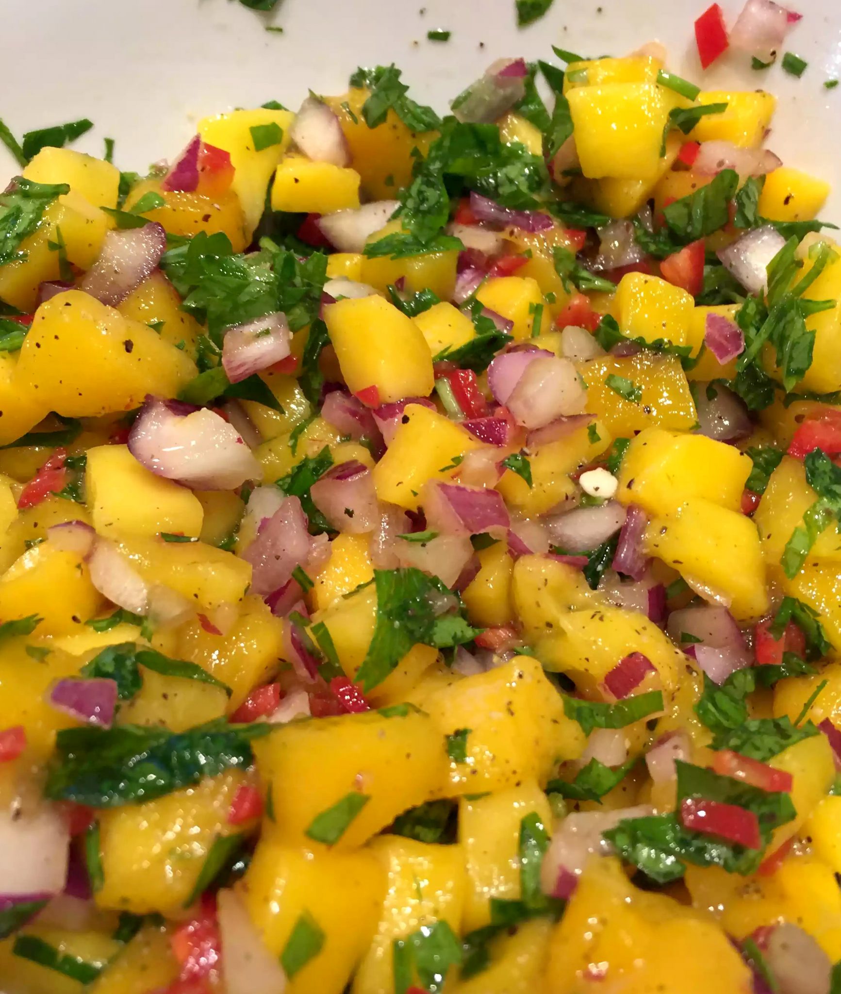 For this recipe you need to make sure your mango is really ripe and sweet otherwise the salsa will be too tart and not juicy enough. Gently squeeze the mango to check that it is not too firm and that it has a bit of give under pressure!