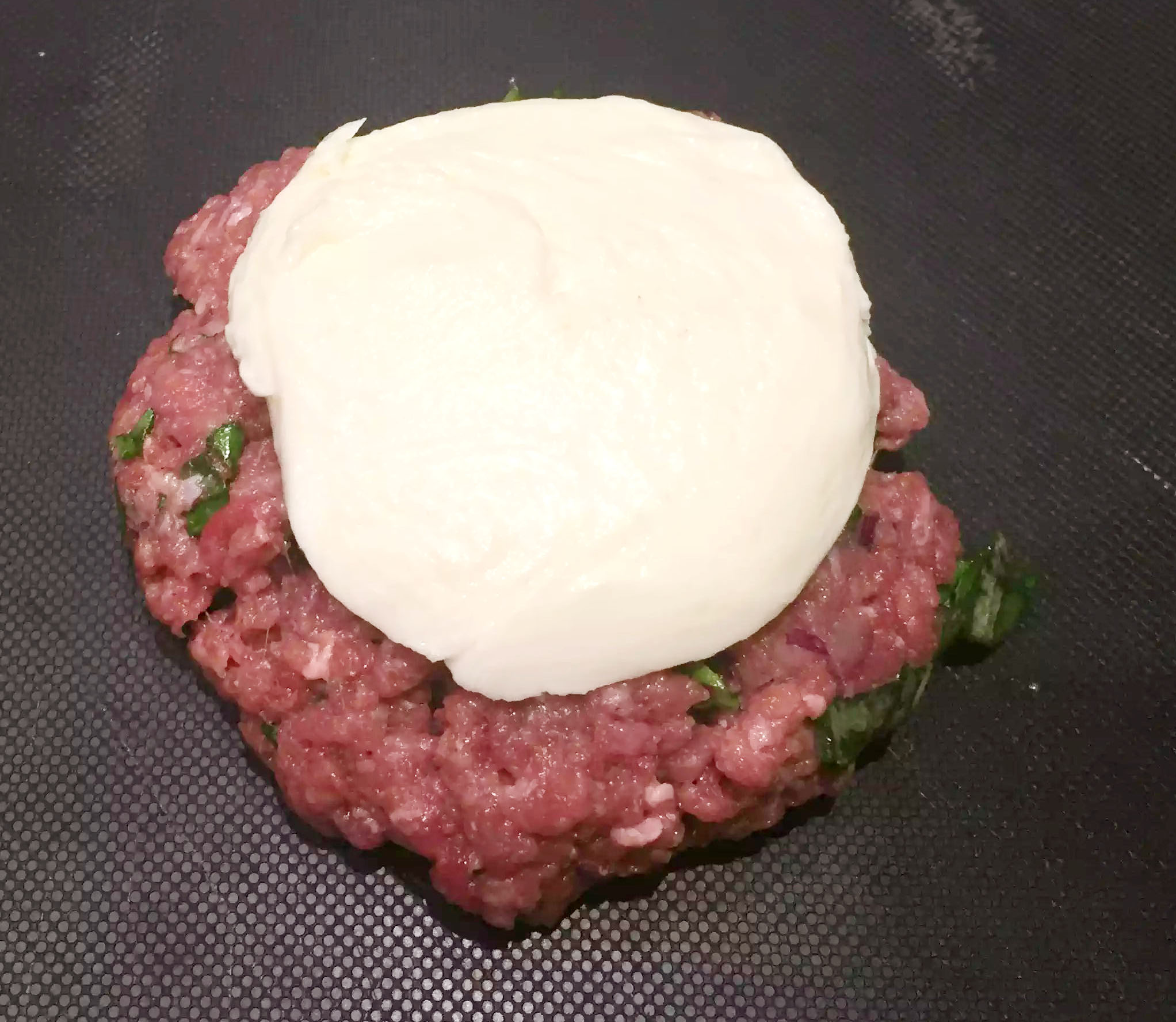 Split each portion in half and shape the half into a round disc. Lay the slice of mozzarella on top of the disc and then, using the remaining half of the mince mixture, mould it around the top of the mozzarella so that you create a burger that completely encases the cheese, making sure that there are no gaps. (Yes they do end up absolutely huge!)