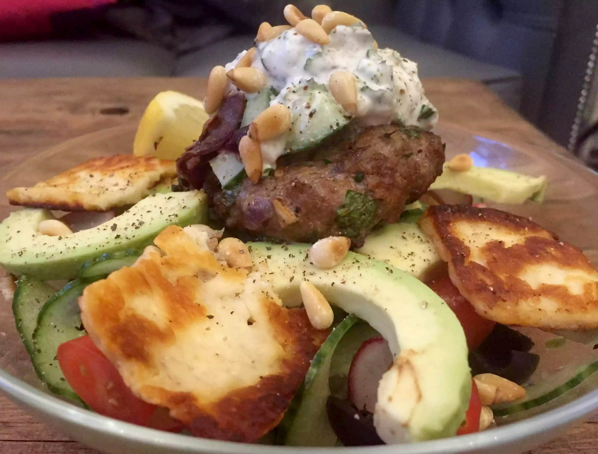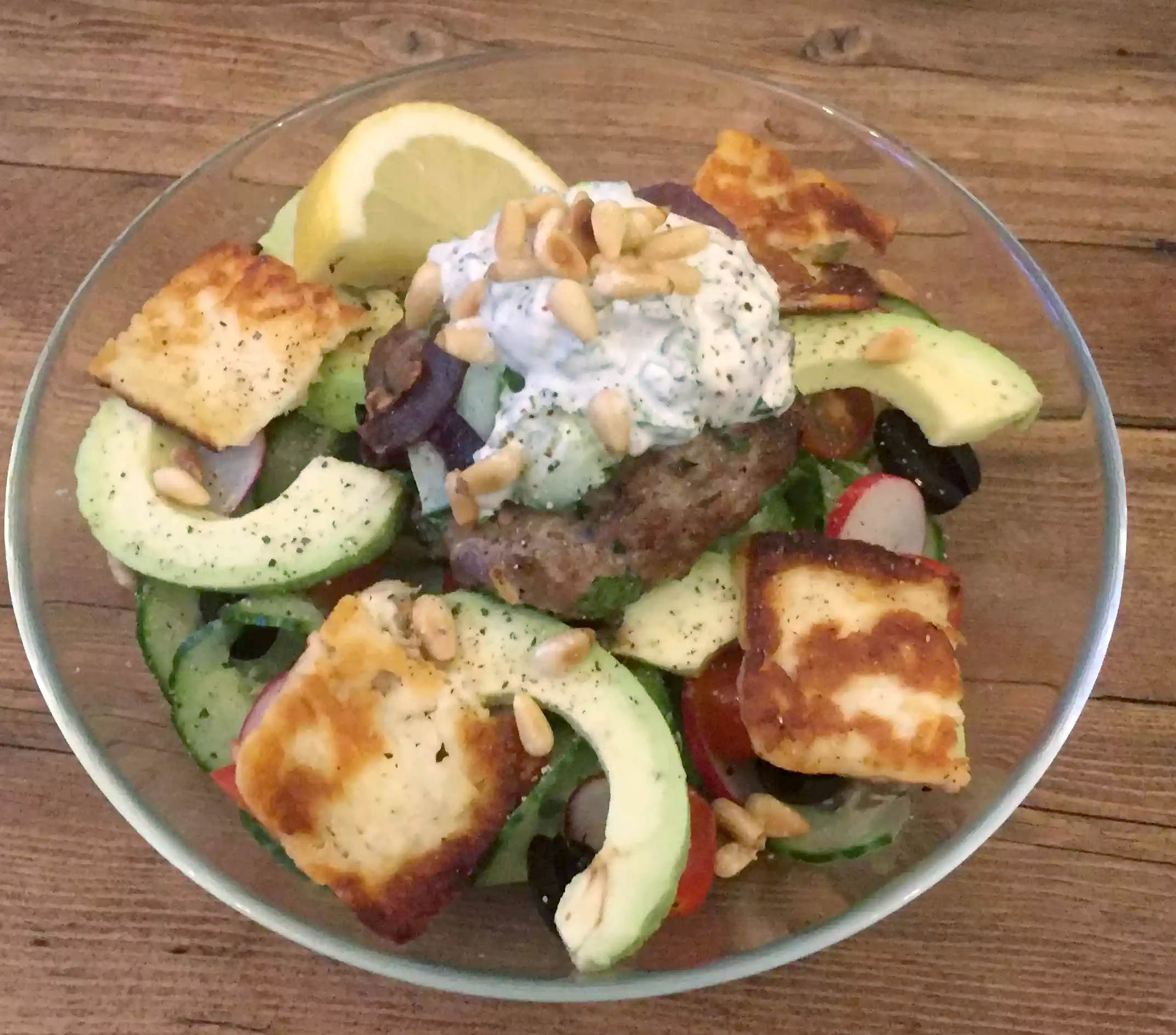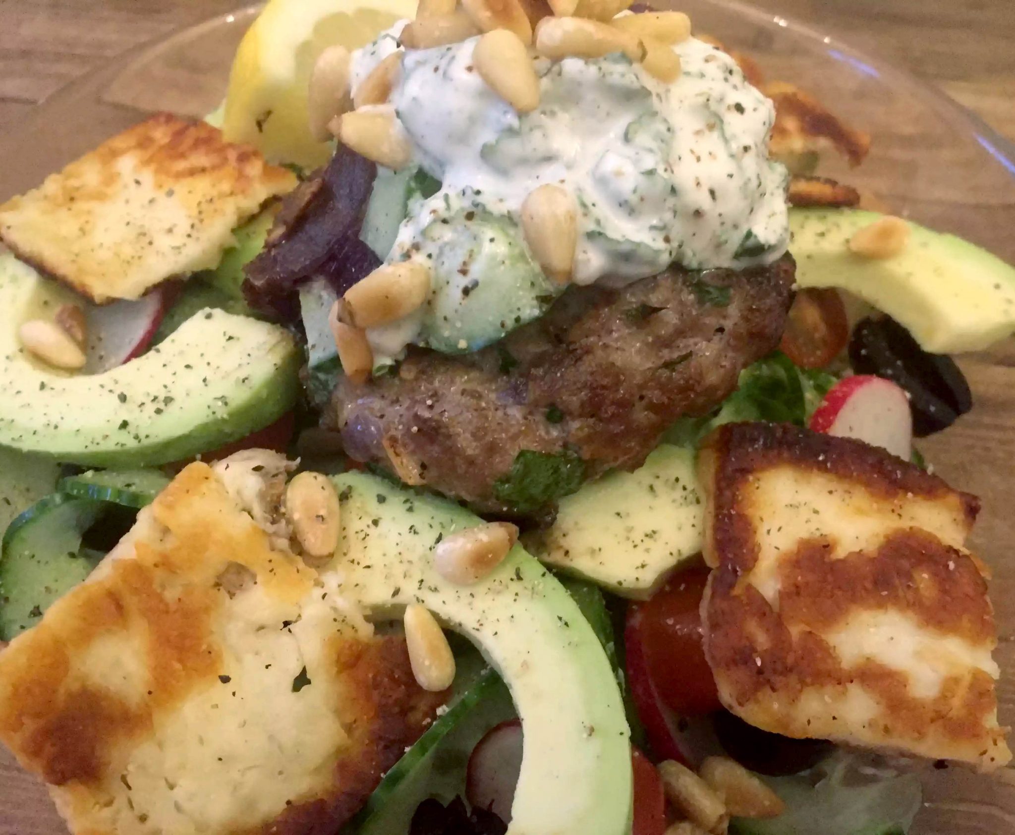 I topped the salad with the lamb burger, a few caramelised onions (which I’d just sliced and cooked off in some butter), a dollop of the tzatziki and sprinkled the toasted pine nuts over everything. Then I drizzled lemon juice and olive oil over the top, seasoned it with salt and pepper and was ready to go.