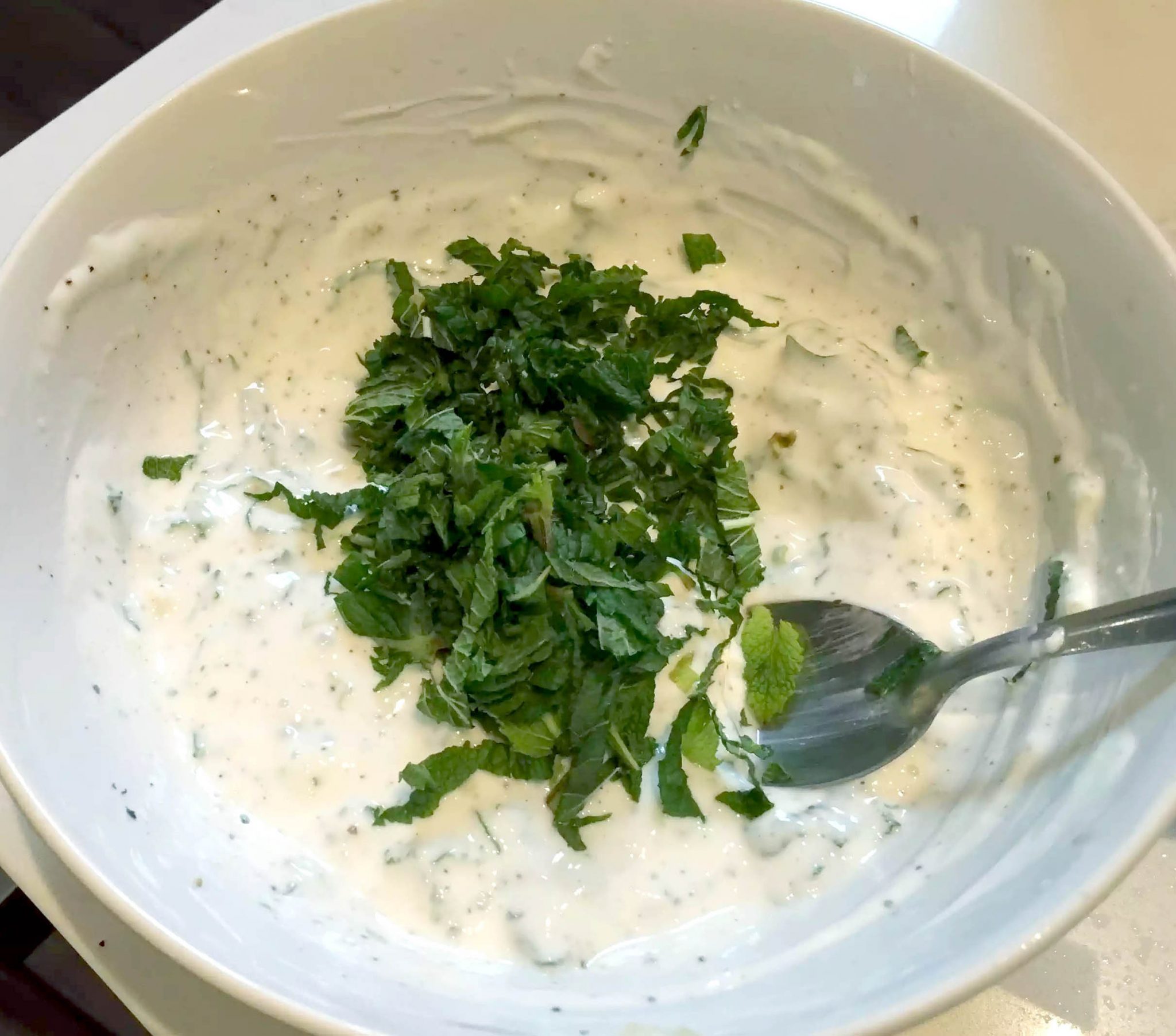 While he was doing this, I made the tzatziki by crushing the garlic clove, chopping the mint, juicing and zesting the lime and mixing everything together with the yoghurt and some salt and pepper for seasoning.