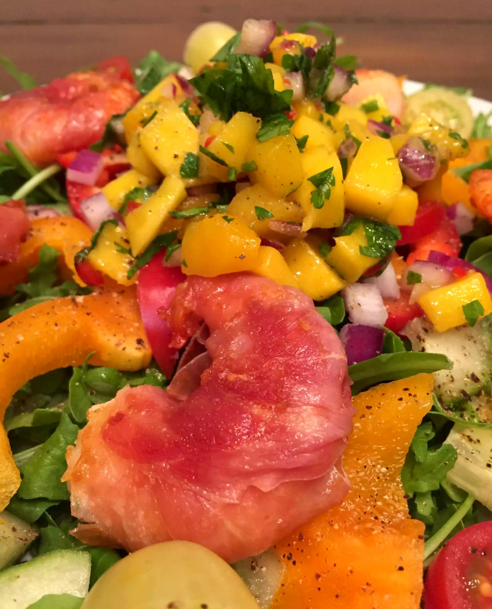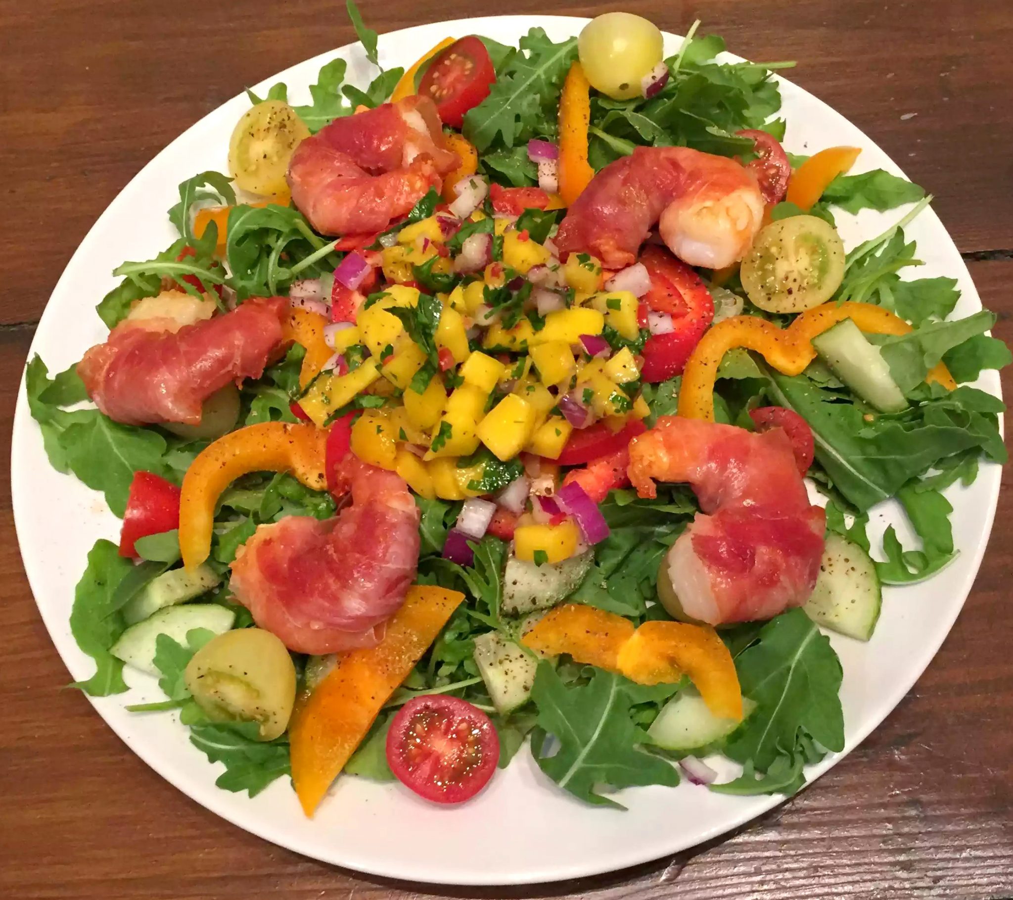 Prosciutto Wrapped Jumbo Shrimp Salad with Mango Salsa