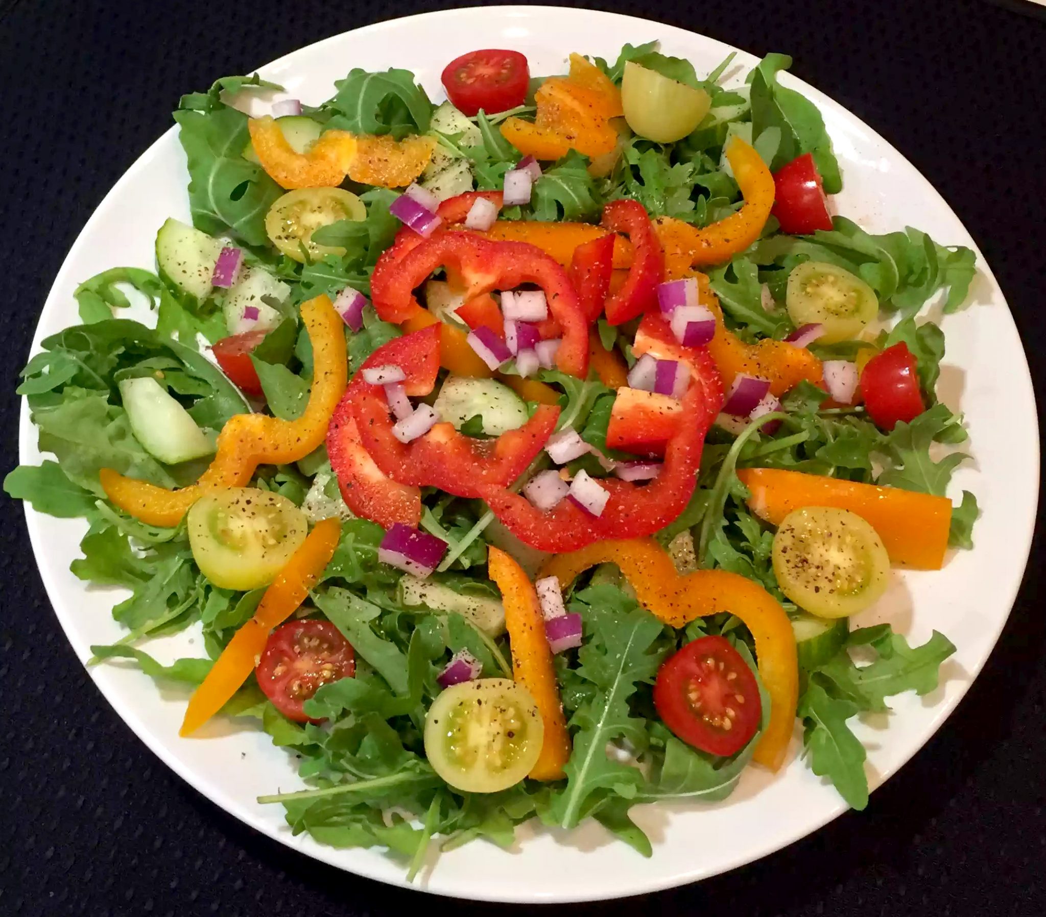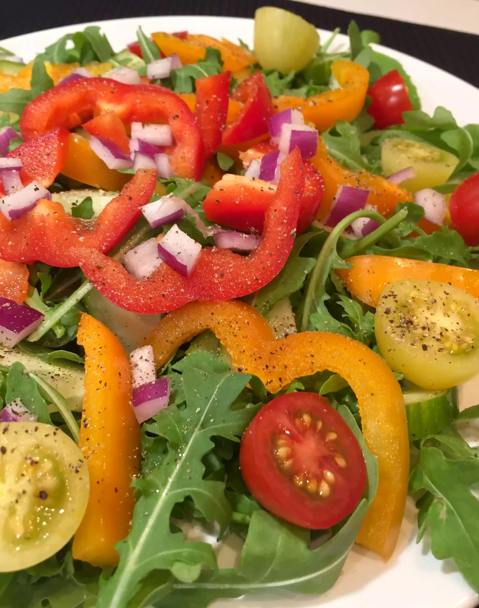 Then it was time to assemble the salad. The actual salad was just a basic mixed one using rocket, the yellow and red cherry tomatoes, orange and red peppers, red onion and cucumber. I chopped everything up and then added plenty of black pepper on the top.
