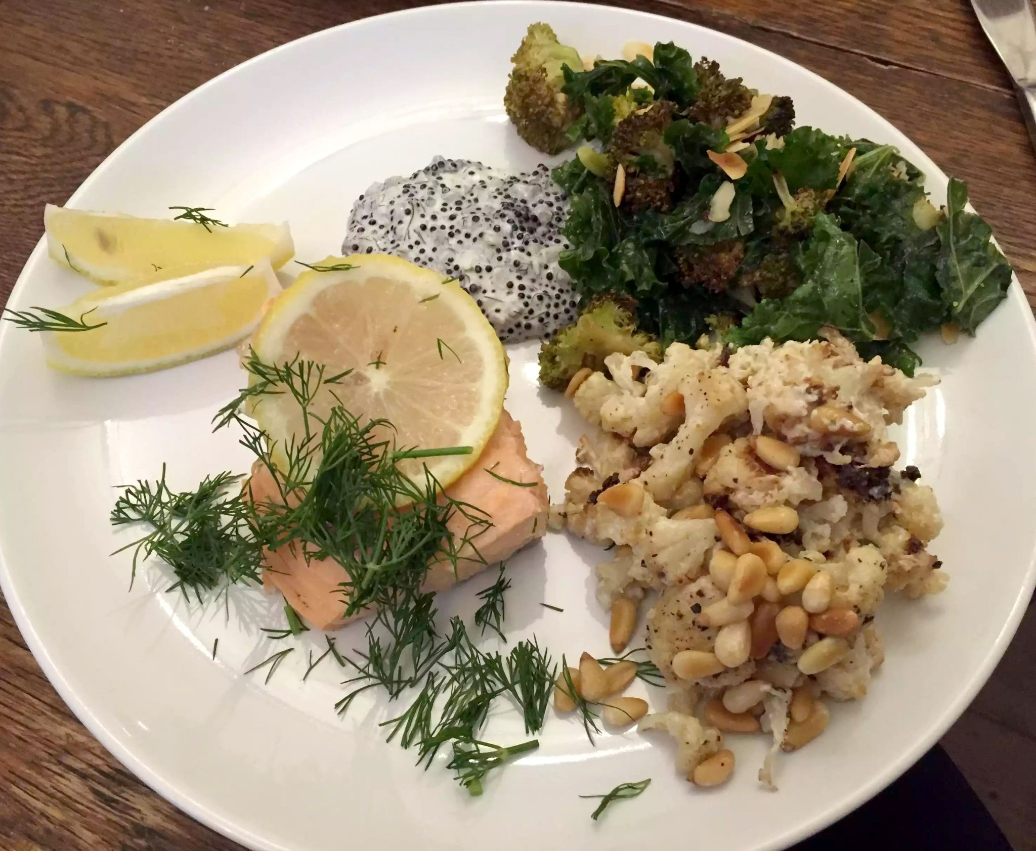 The herring was delicious, and went so well with the caviar and sour cream mix that she’d made and the cauliflower dish went very well next to the poached salmon! I also served my Kale, Roasted Broccoli & Toasted Almond Salad with Lemon Dressing which was a huge hit. A very light dinner all round but so full of flavour!