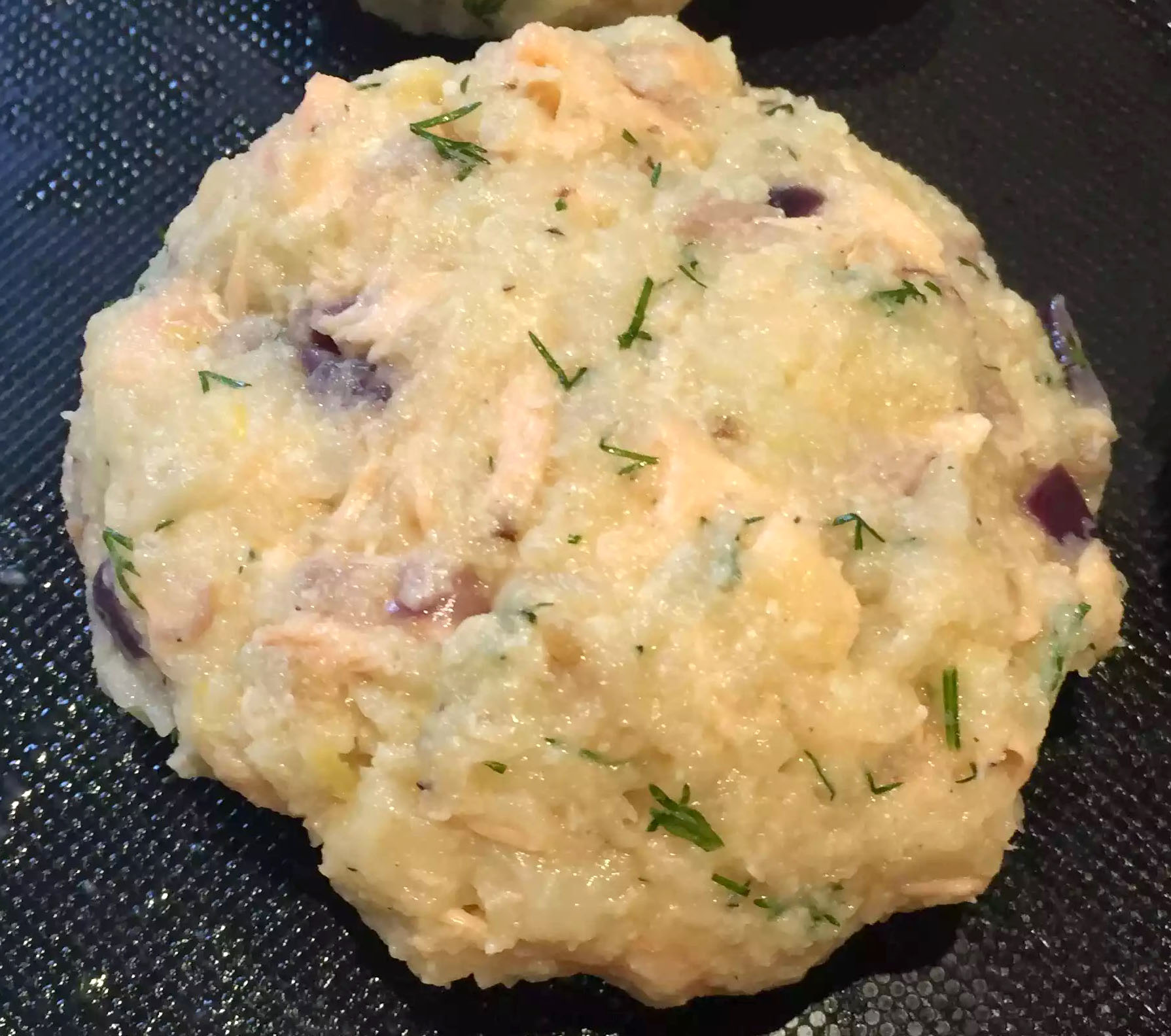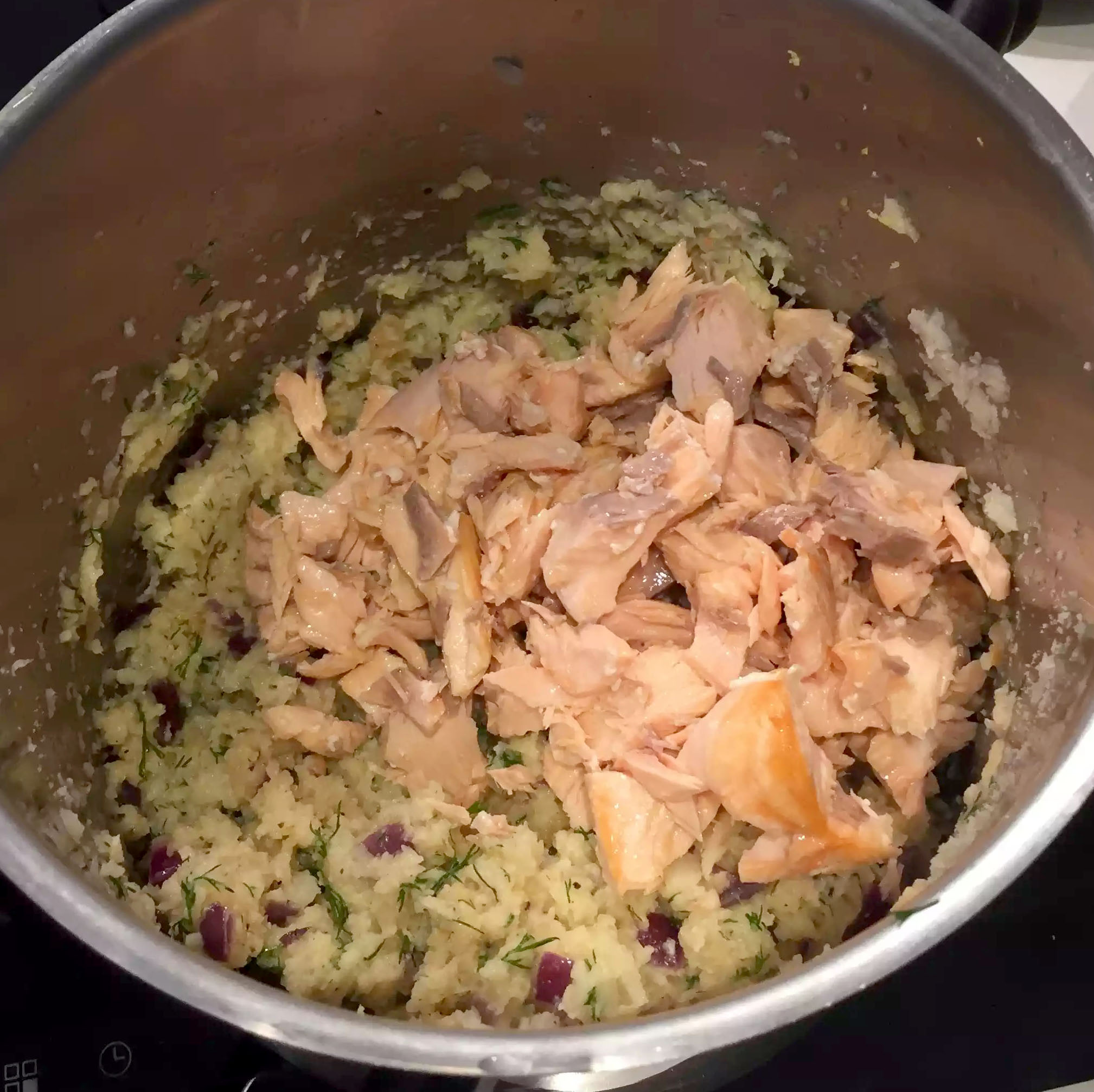 Then I set Dan to work mashing the celeriac up and zesting and juicing the lemon into it while I chopped the onion and crushed the garlic before frying them in a pan to soften them a bit – dream team! It really is so much easier with two. While the onion and garlic mixture was softening, Dan added the eggs and almond flour and seasoned the mixture while I chopped up some fresh dill (make sure you keep some of this aside for the mayonnaise later). He then stirred all of this together to combine it thoroughly while I flaked the cooked salmon into fairly large pieces. Making sure not to break it up to much, this was then stirred carefully through the rest of the mixture.
