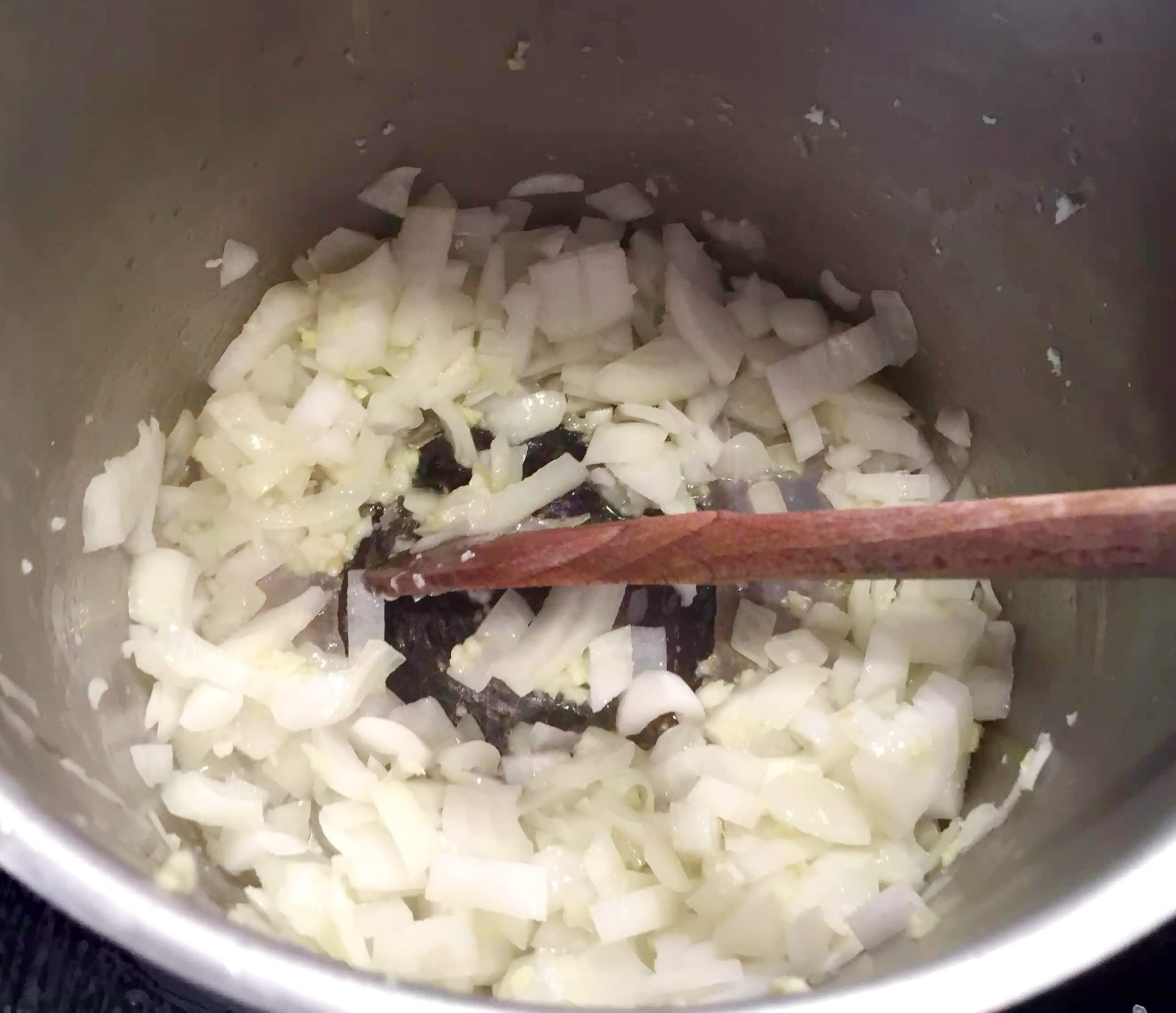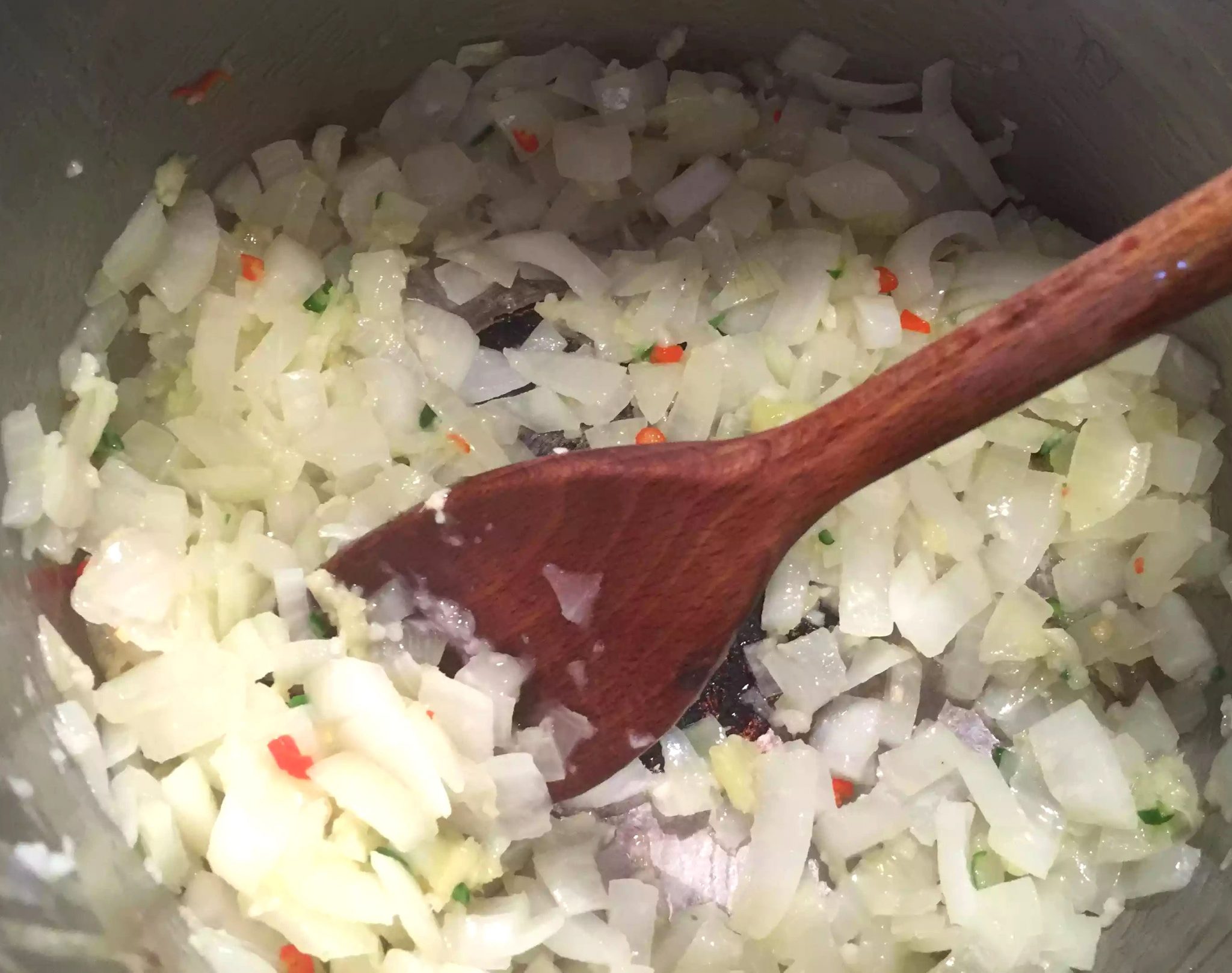 I started by dicing up the onions and crushing the garlic and ginger. I then fried these off in 2tbsps oil (leaving 1 tsp remaining to fry the rice in later) until they had softened and browned a bit.