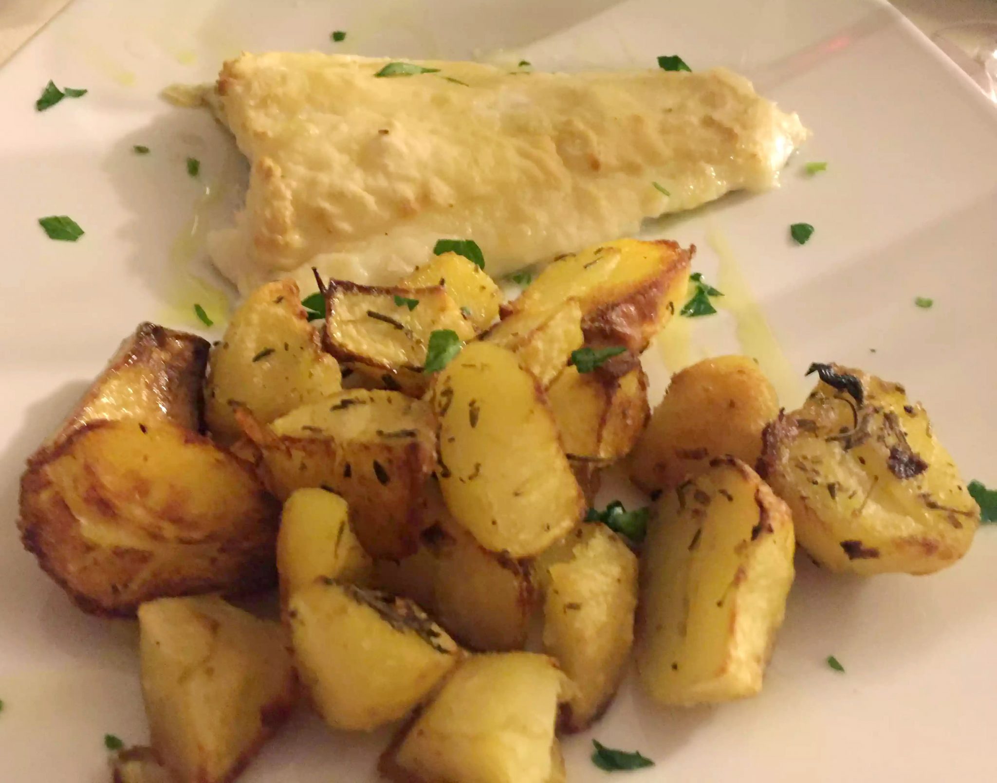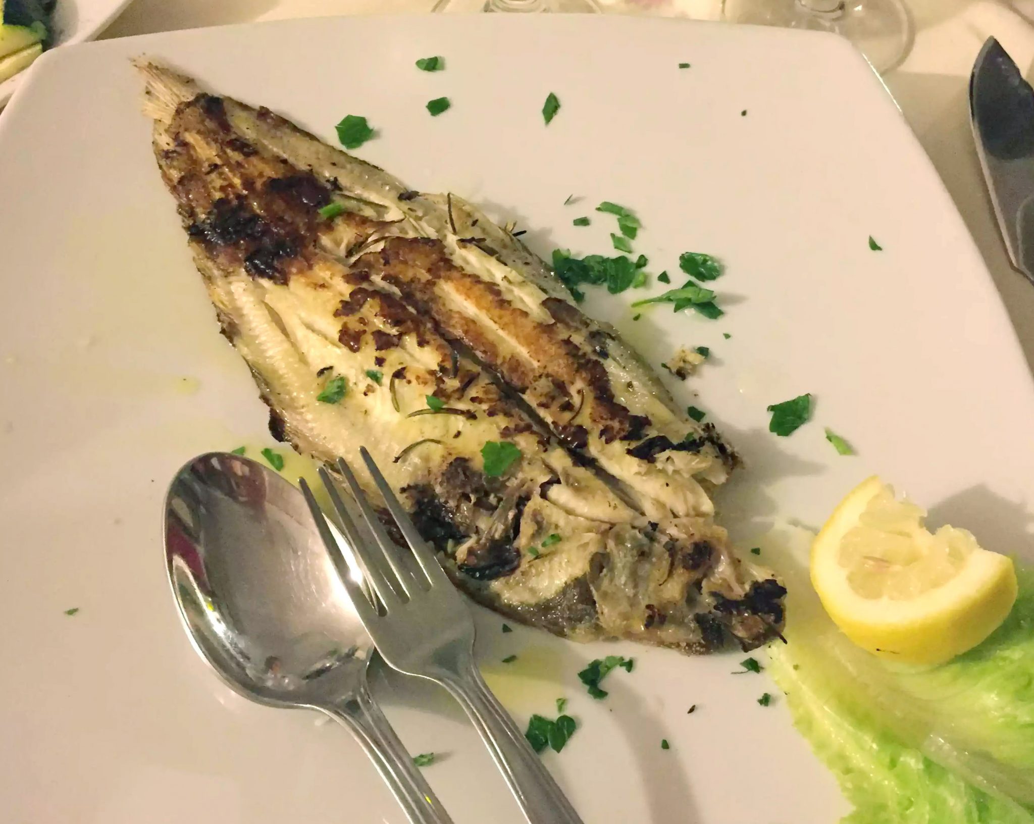 The restaurant, Locanda dei Mille, was in the main square and looked busy and full of locals, so although we didn’t have much choice due to the rain, it seemed like a safe bet. We ordered a carafe of the house white and Dan went for pasta while I chose the sea bass done three ways.