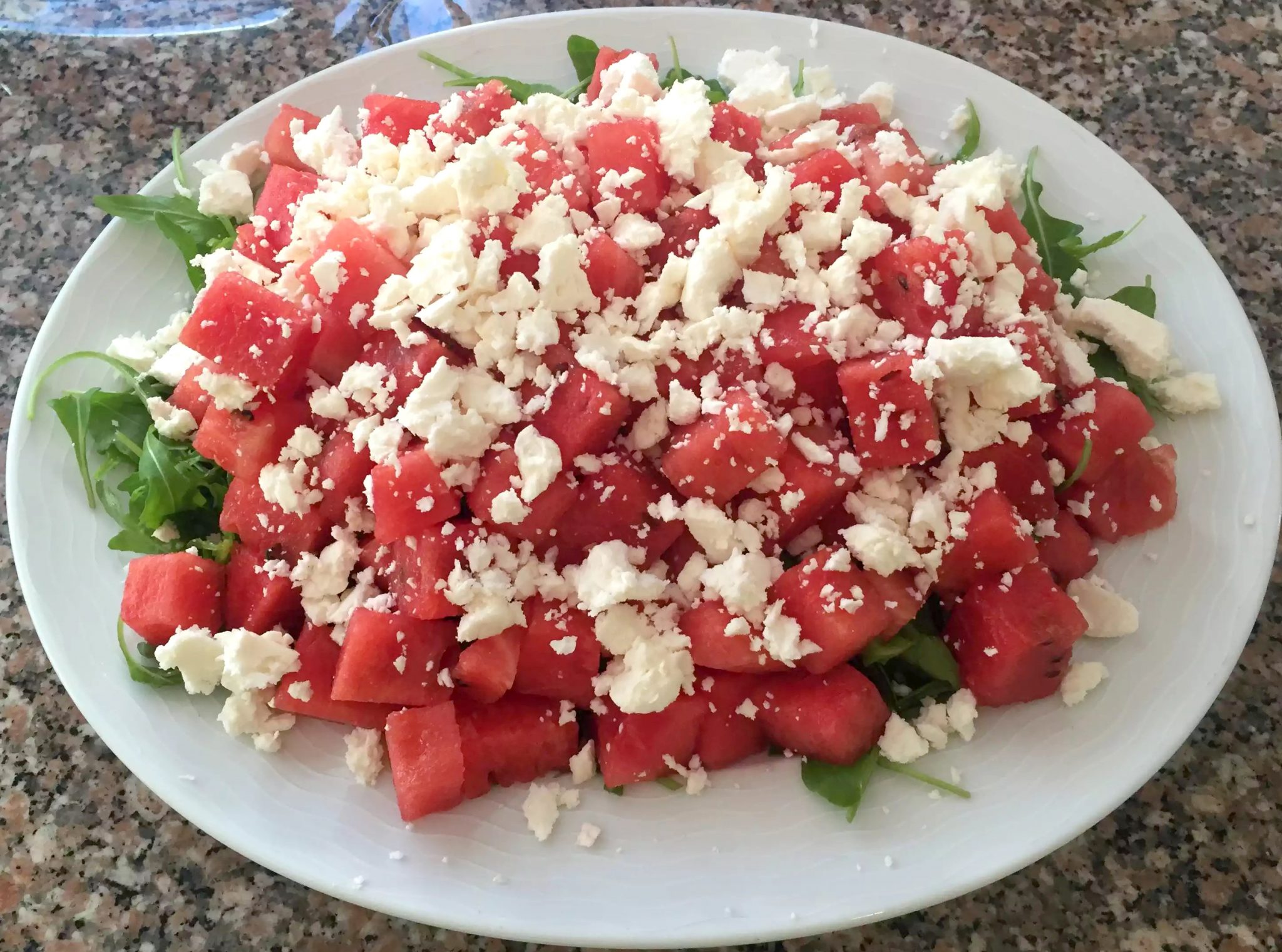 I started by dicing the watermelon into large cubes (about and inch square). I then arranged some rocket on a platter and added the watermelon on top.